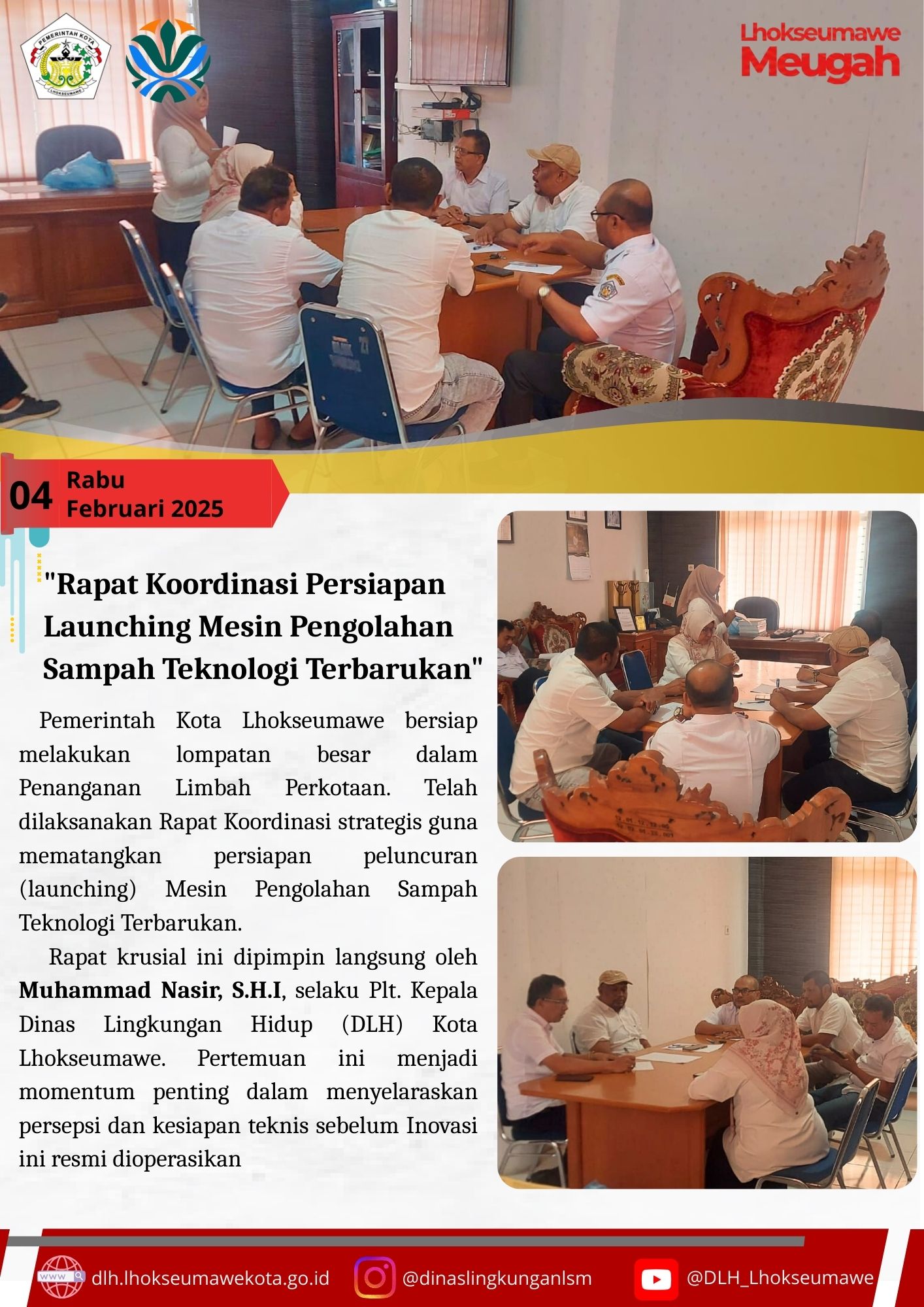 Pemerintah Kota Lhokseumawe bersiap melakukan lompatan besar dalam penanganan limbah perkotaan. Pada Rabu, 04 Februari 2026, bertempat di Ruang Rapat Utama Kepala Dinas, telah dilaksanakan Rapat Koordinasi strategis guna mematangkan persiapan peluncuran (launching) Mesin Pengolahan Sampah Teknologi Terbarukan.